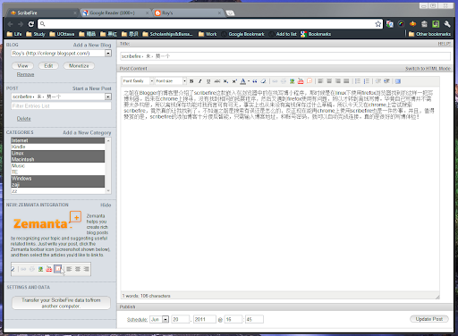 之前在Blogger的博客里介绍了scribefire这款嵌入在浏览器中的在线写博小程序,那时候是在linux下使用firefox浏览器找到的这样一把写博利器。后来在chrome上搜寻,没有找到相同的拓展程序,然后又遇到firefox使用有问题,所以才转到离线写博。毕竟自己写博并不需要太多构思,所以离线保存功能对我而言可有可无,事实上也从来没有离线保存过什么草稿。所以今天又在chrome上尝试搜索scribefire,竟然真的让我找到了。不知道之前是搜索有误还是怎么的,反正现在能再chrome上使用scribefire也是一件妙事。并且,值得赞赏的是,scribefire的添加博客十分傻瓜智能,只需输入博客地址,和账号密码,就可以自动完成连接。真的是很好的写博体验!